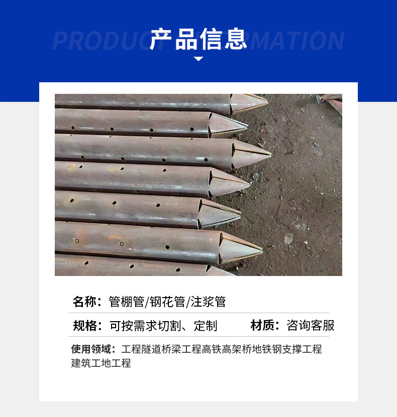 公司主营:声测管,注浆管,小导管,钢花管,管棚管,架子管,测压管,冷却管,隧道管等。